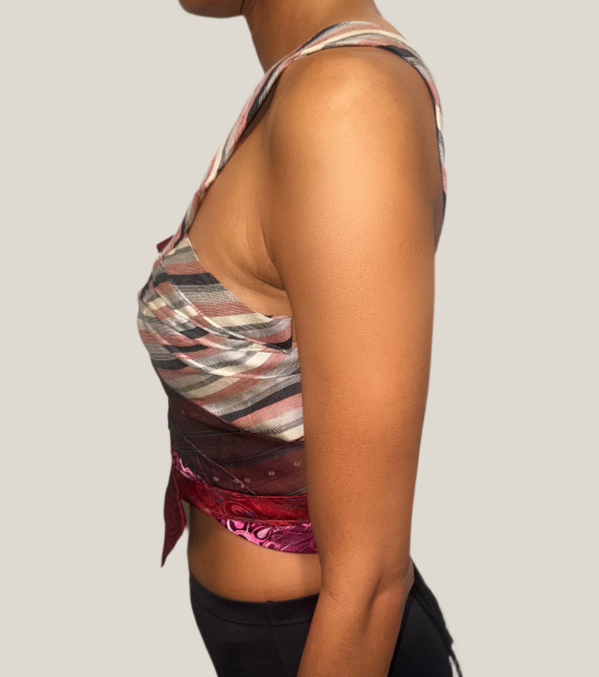 Sustainably crafted asymmetrical cut featuring lace up string at back for a cinched fit. Entirely one-of-a-kind, these corsets are as unique as you are. Perfect for turning heads and rewriting fashion rules. Great to wear as a stand alone piece, or layer with a tee or button-up.